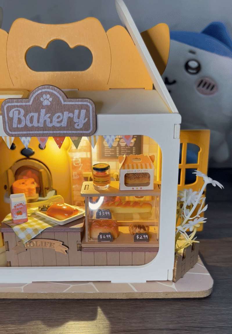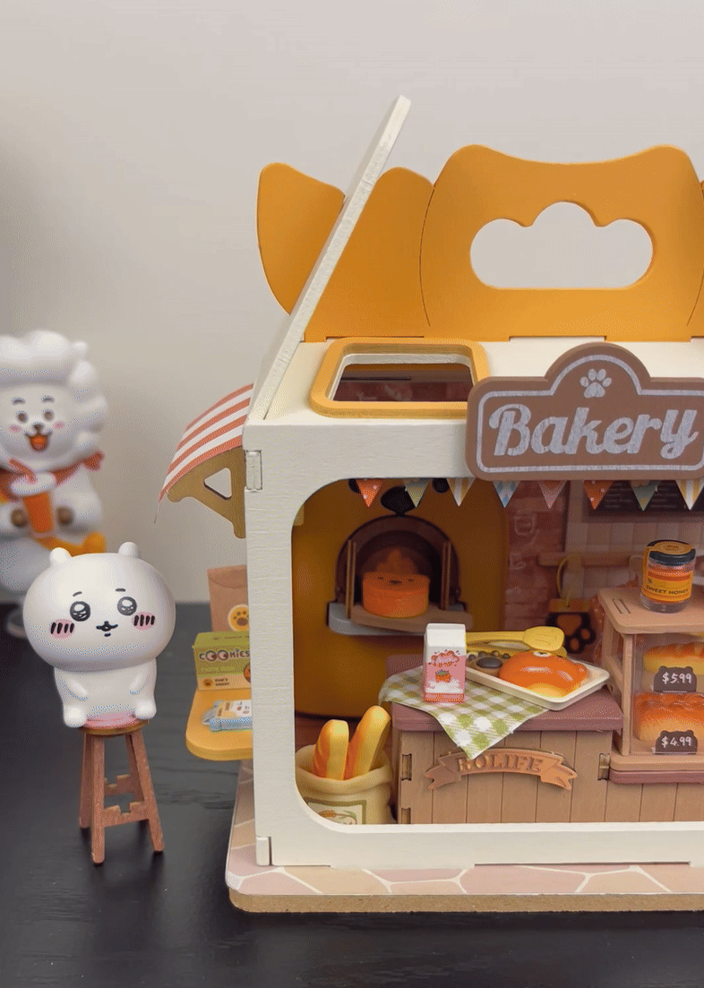 Each kit includes pre-cut wood/plastic pieces, tiny bakery accessories, LED lighting, and assembly instructions. Everything you need to create the full scene!